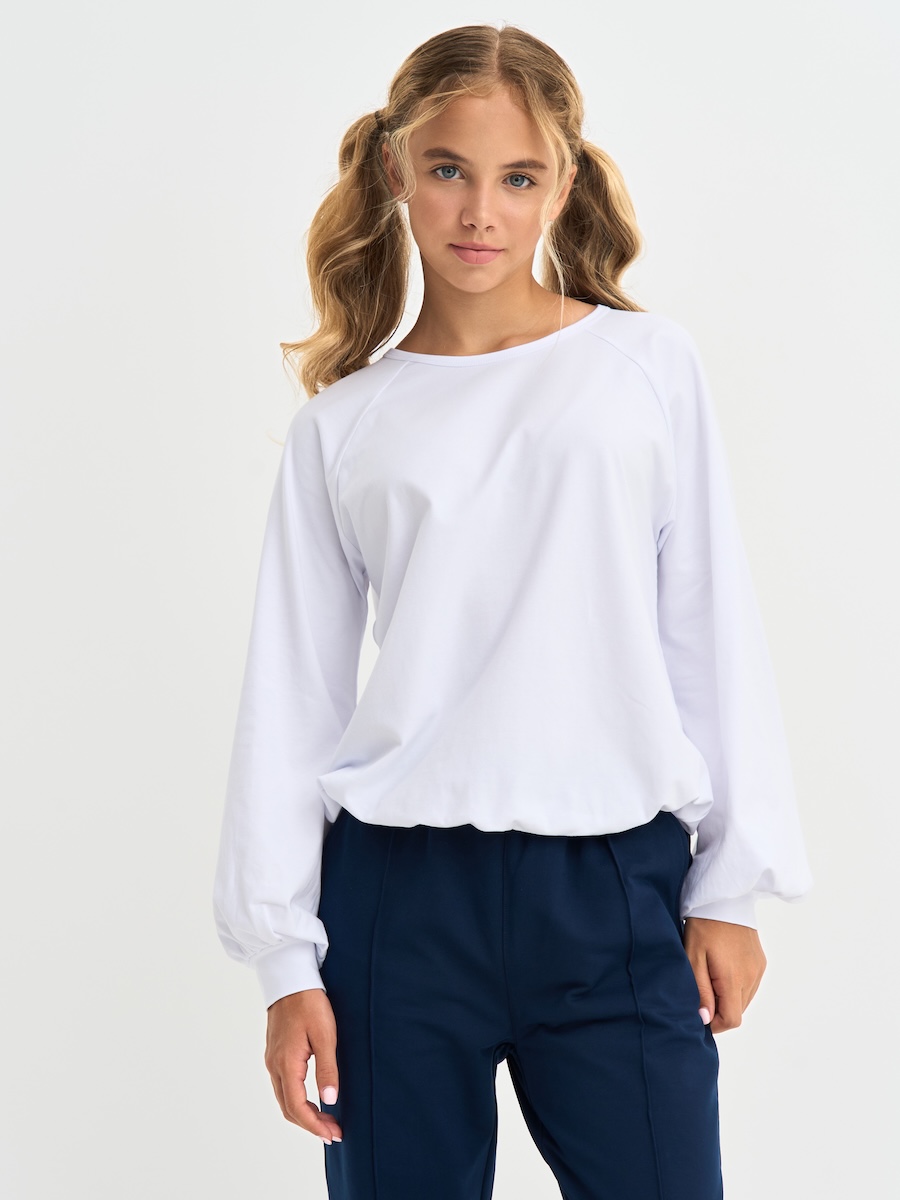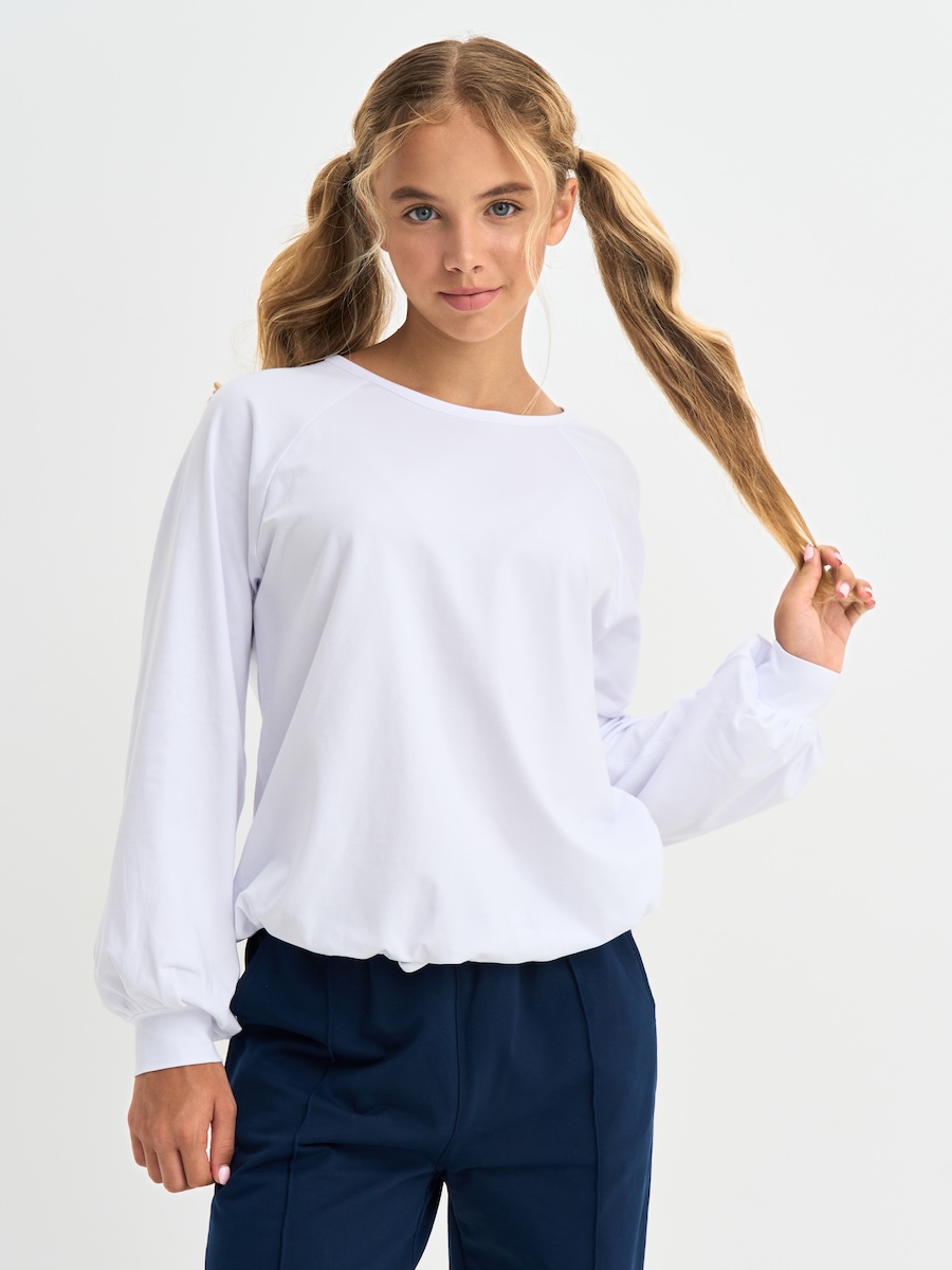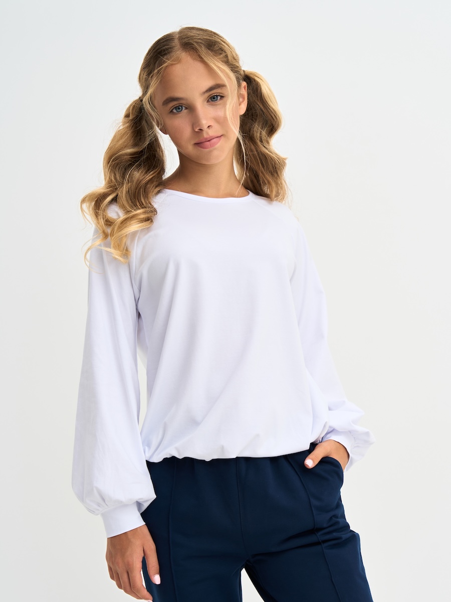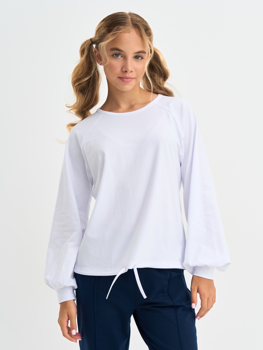 Лонгслив для девочки выполнен из полотна кулирная гладь, модель со спущенным плечом и широкими рукавами, по низу джемпера кулиска с фиксирующим шнурком.