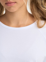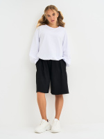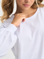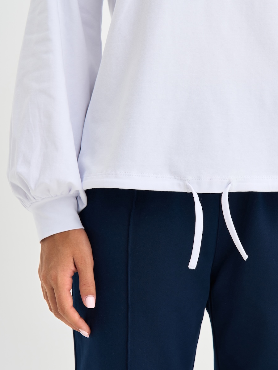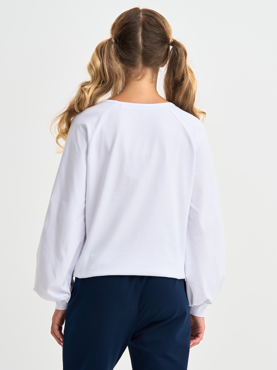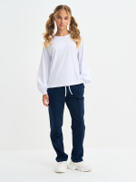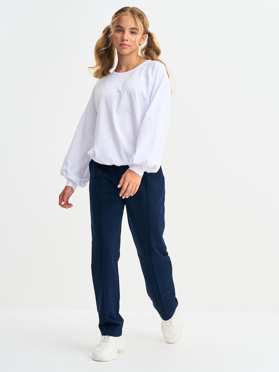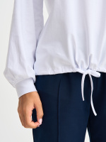 Лонгслив для девочки выполнен из полотна кулирная гладь, модель со спущенным плечом и широкими рукавами, по низу джемпера кулиска с фиксирующим шнурком.
