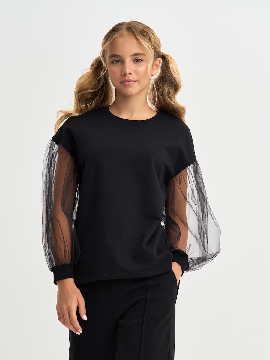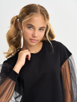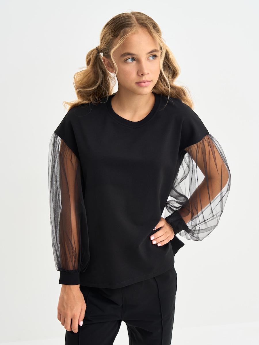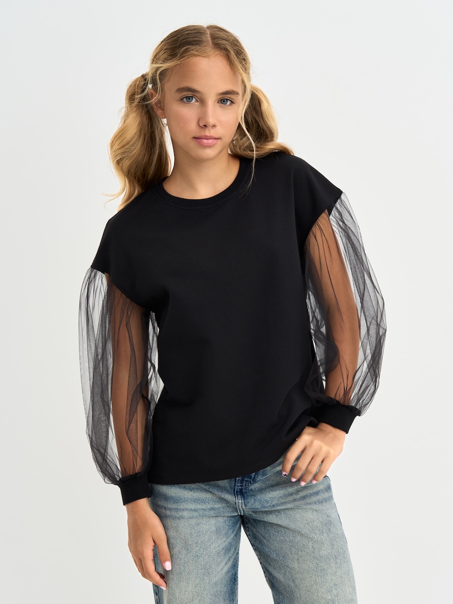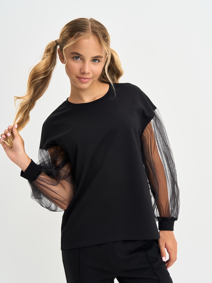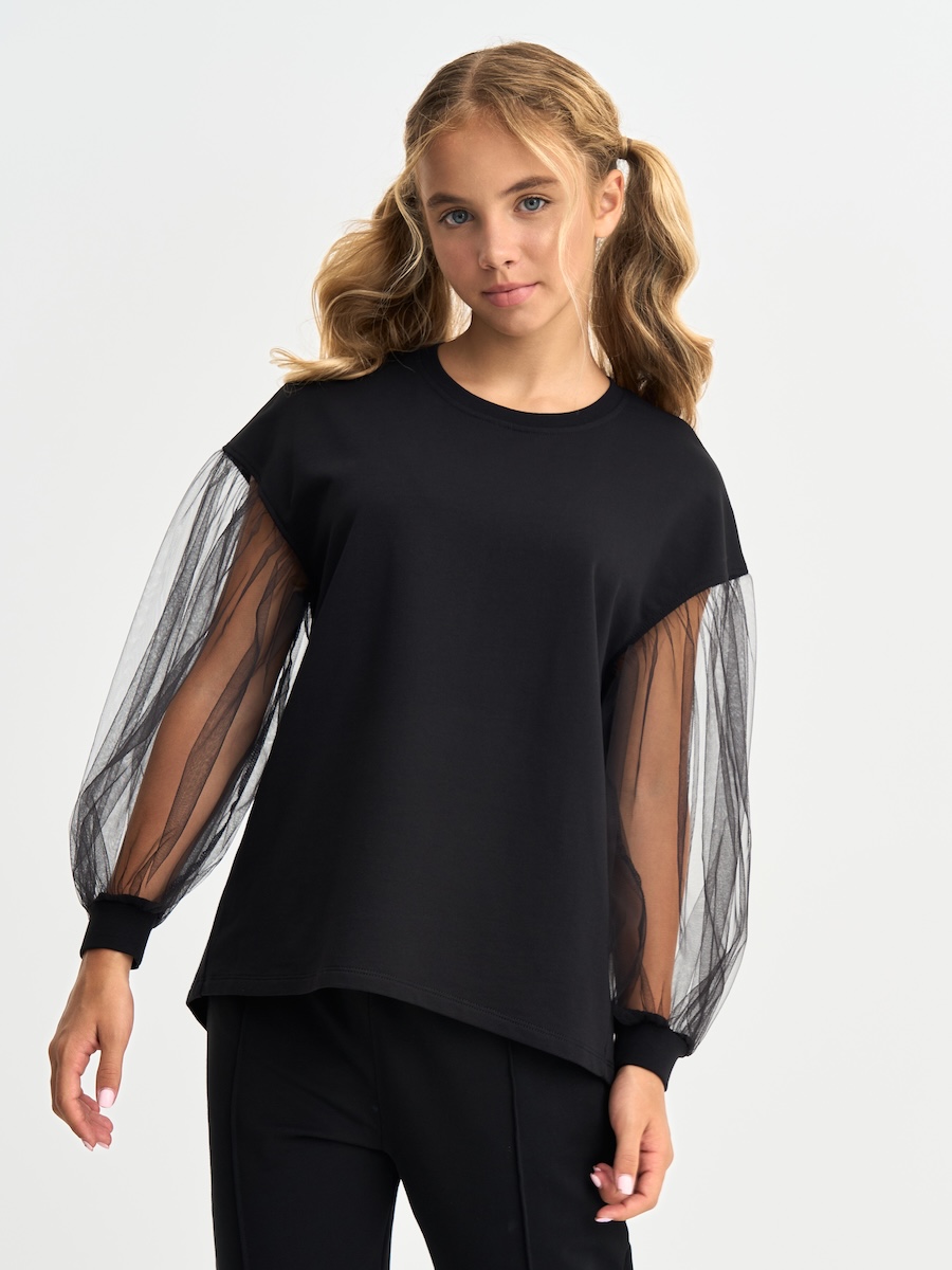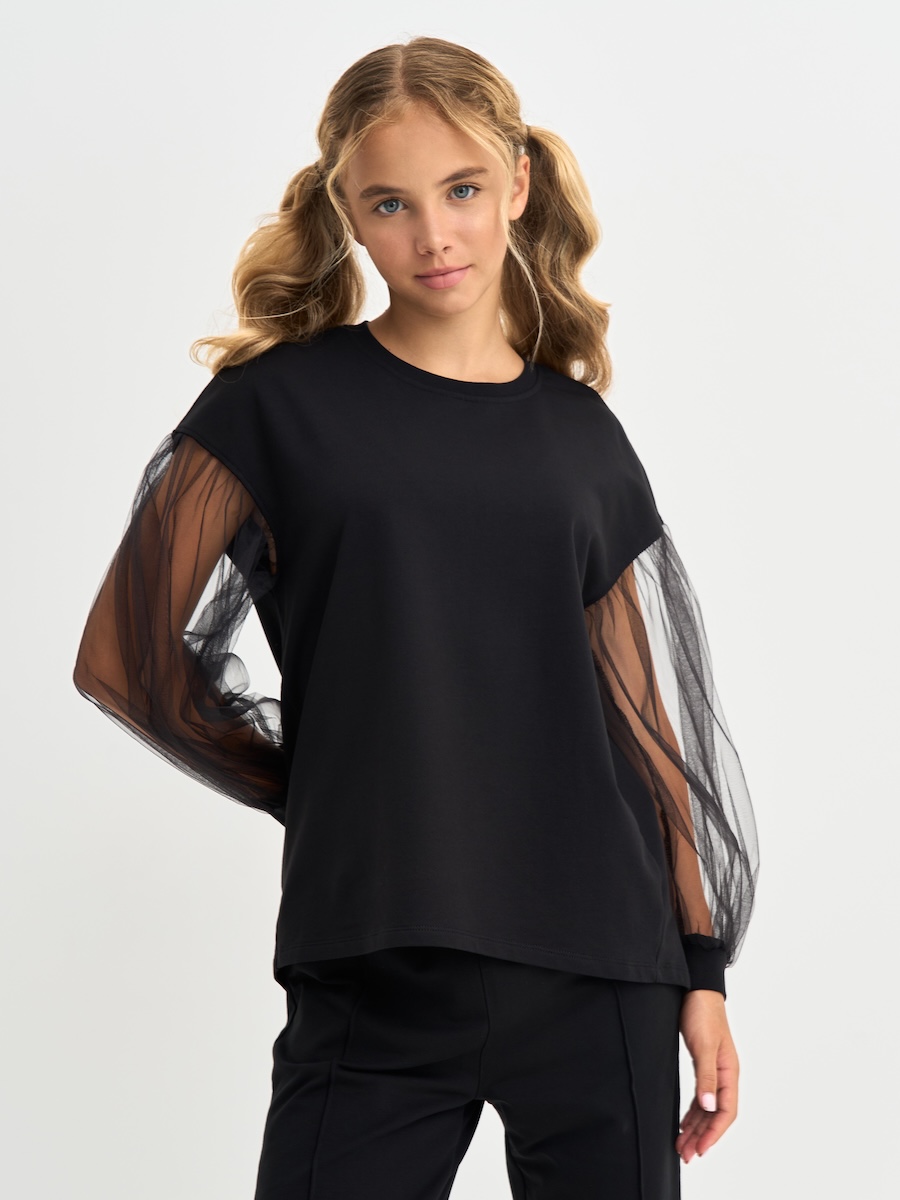Кофта для девочки с пышными рукавами из фатина, линия плеча приспущена, спинка удлиненная. Джемпер выполнен из петлевого футера, 95% хлопок, 5% эластан.