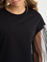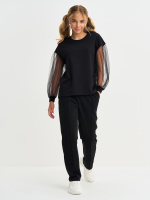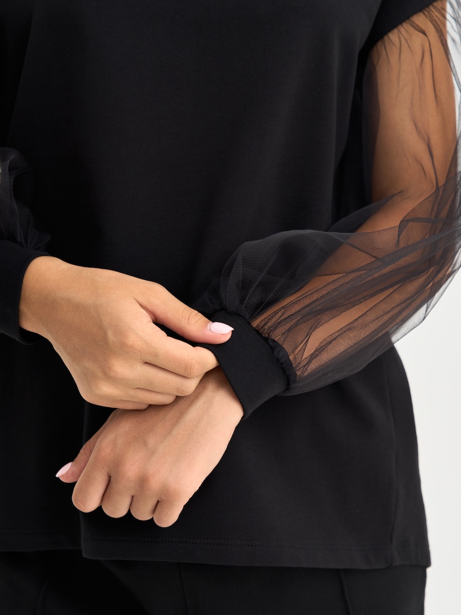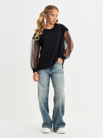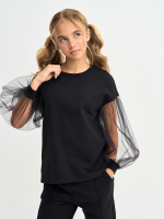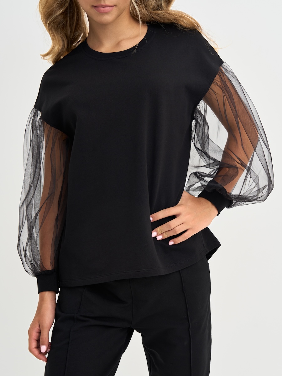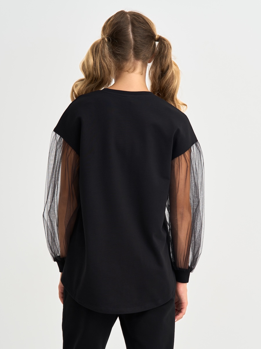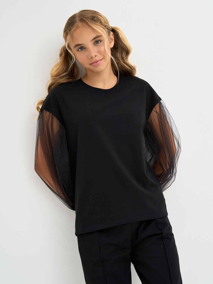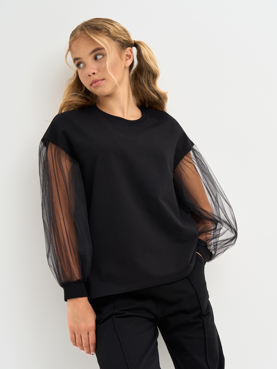 Кофта для девочки с пышными рукавами из фатина, линия плеча приспущена, спинка удлиненная. Джемпер выполнен из петлевого футера, 95% хлопок, 5% эластан.