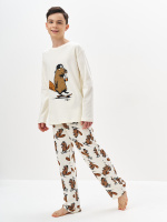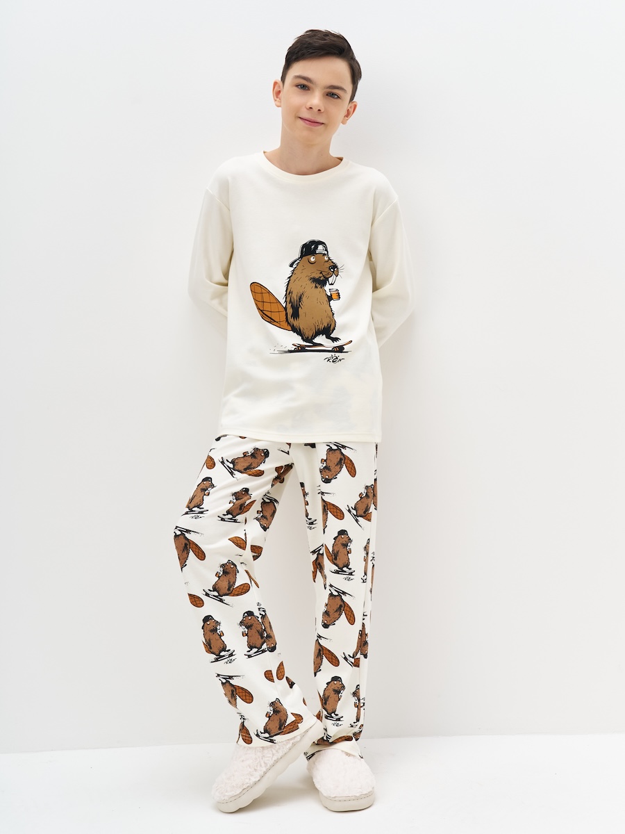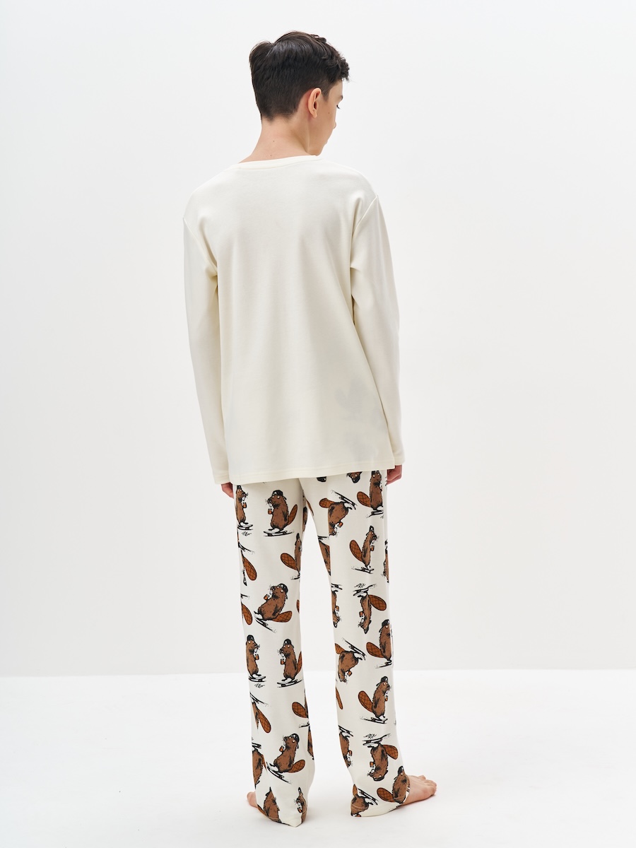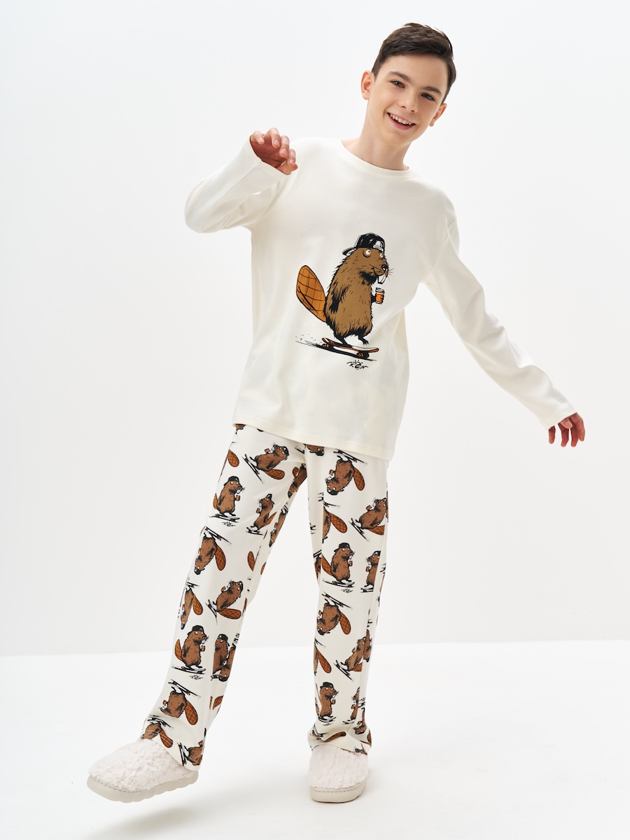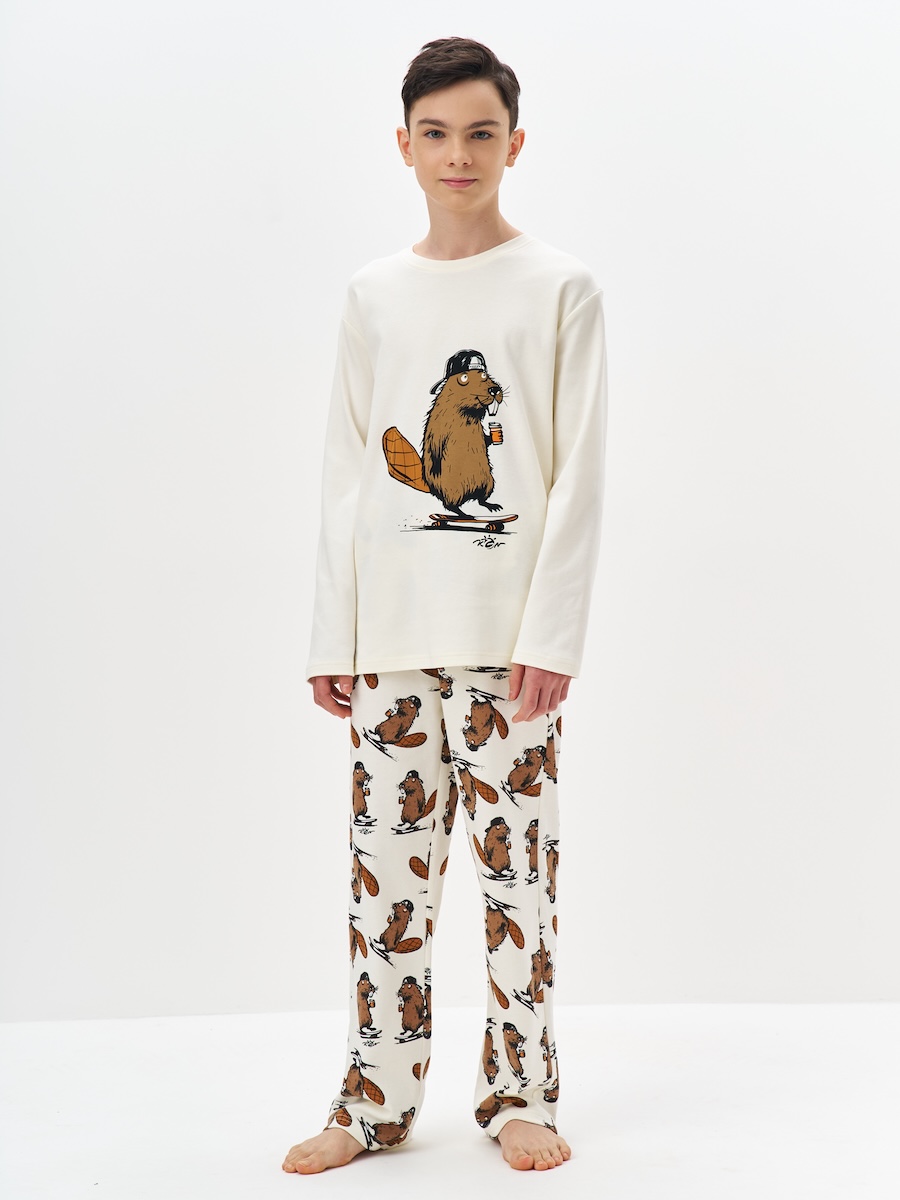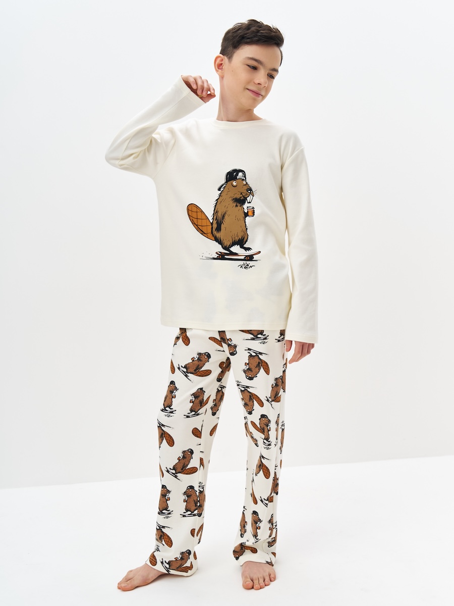 Пижама для мальчика с лонгсливом и широкими брюками с карманами. Выполнена из полотна интерлок 100% хлопок.