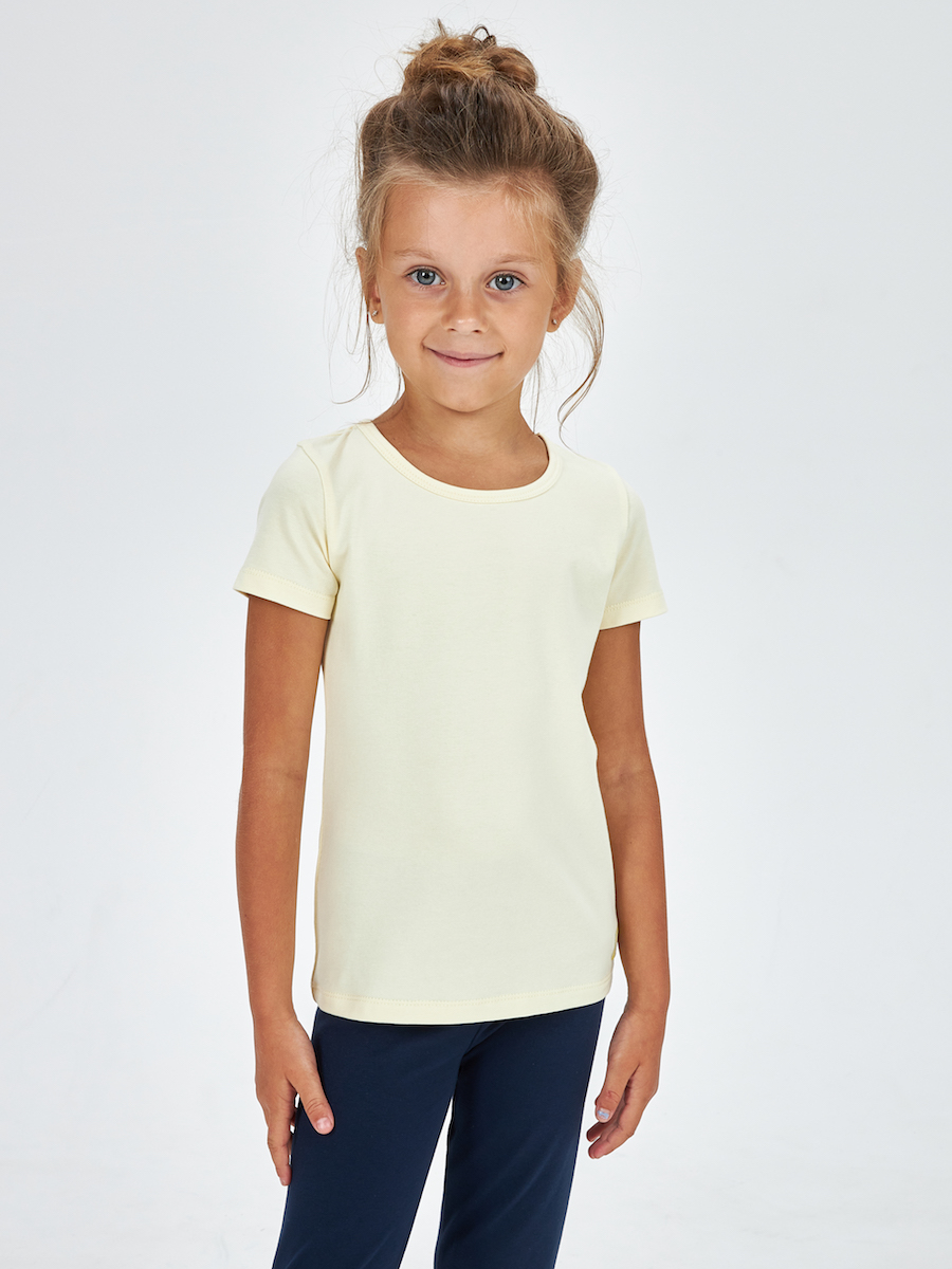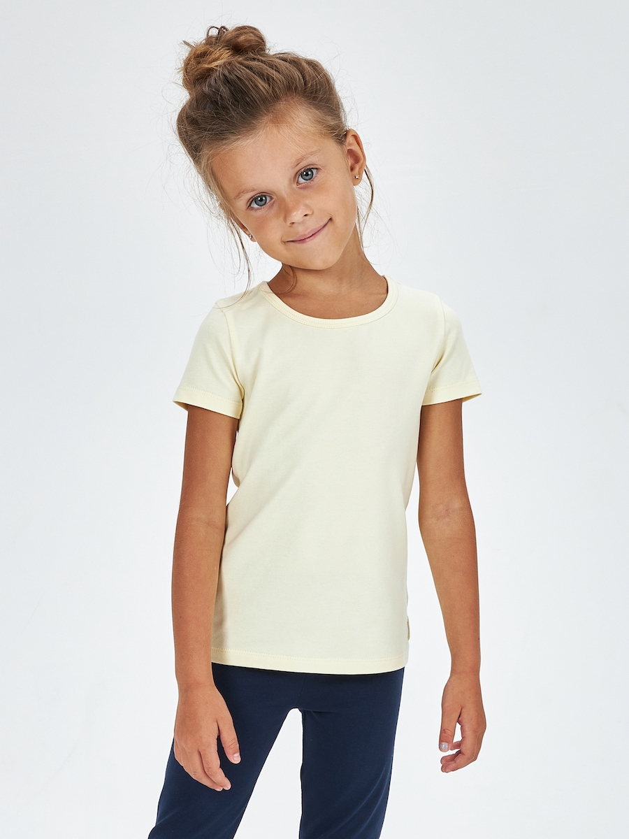 Базовая футболка для девочки из натурального хлопка с добавлением эластана. Футболка не деформируется и не растягивается в процессе использования и после стирки. Футболка представлена в трех базовых цветах: белый, пудровый, ванильный. Широкий размерный ряд с 92 по 164 размер. Подойдет на каждый день для школы, детского сада, уроков физкультуры и повседневной носки.