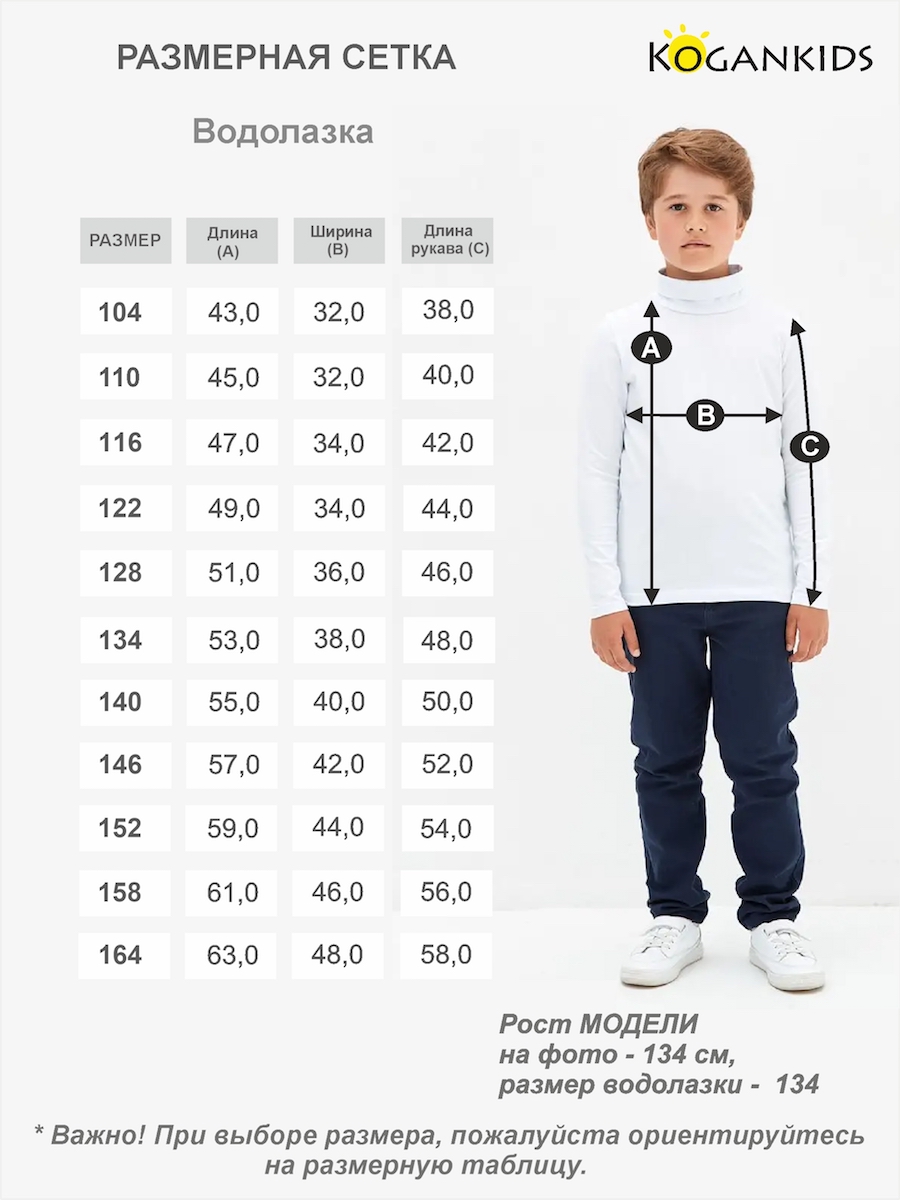 Водолазка для школы и повседневной носки, водолазка для малыша выполнена из высокачественного натурального хлопка с небольшим добавлением эластана. Водолазка для школьников KoganKids имеет ОЧЕНЬ УДОБНУЮ горловину, которая позволяет легко одевать и снимать её, но при этом максимально комфортно облегает шею ребёнка при носке. Водолазка для мальчиков школьная отлично тянется, что способствует удобной и комфортной посадке на ребенке и свободе движения. Не деформируется и не растягивается в процессе эксплуатации и после стирки.