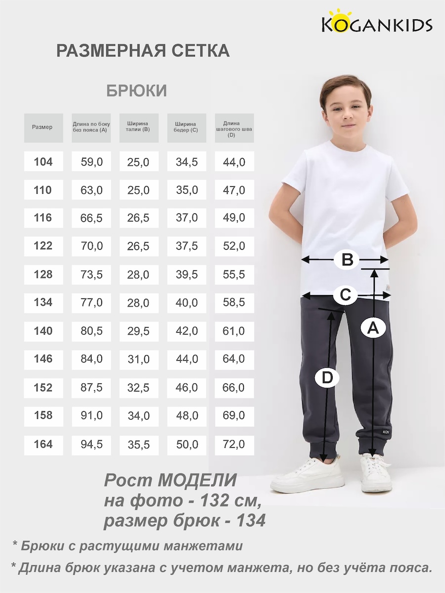 Брюки с карманами и широкой манжетой для мальчиков, выполнены из футера с начесом плотностью 320 г/м, состав 80% хлопок 20%. На брюках манжета, которую можно отворачивать или подворачивать, для регулировки длины