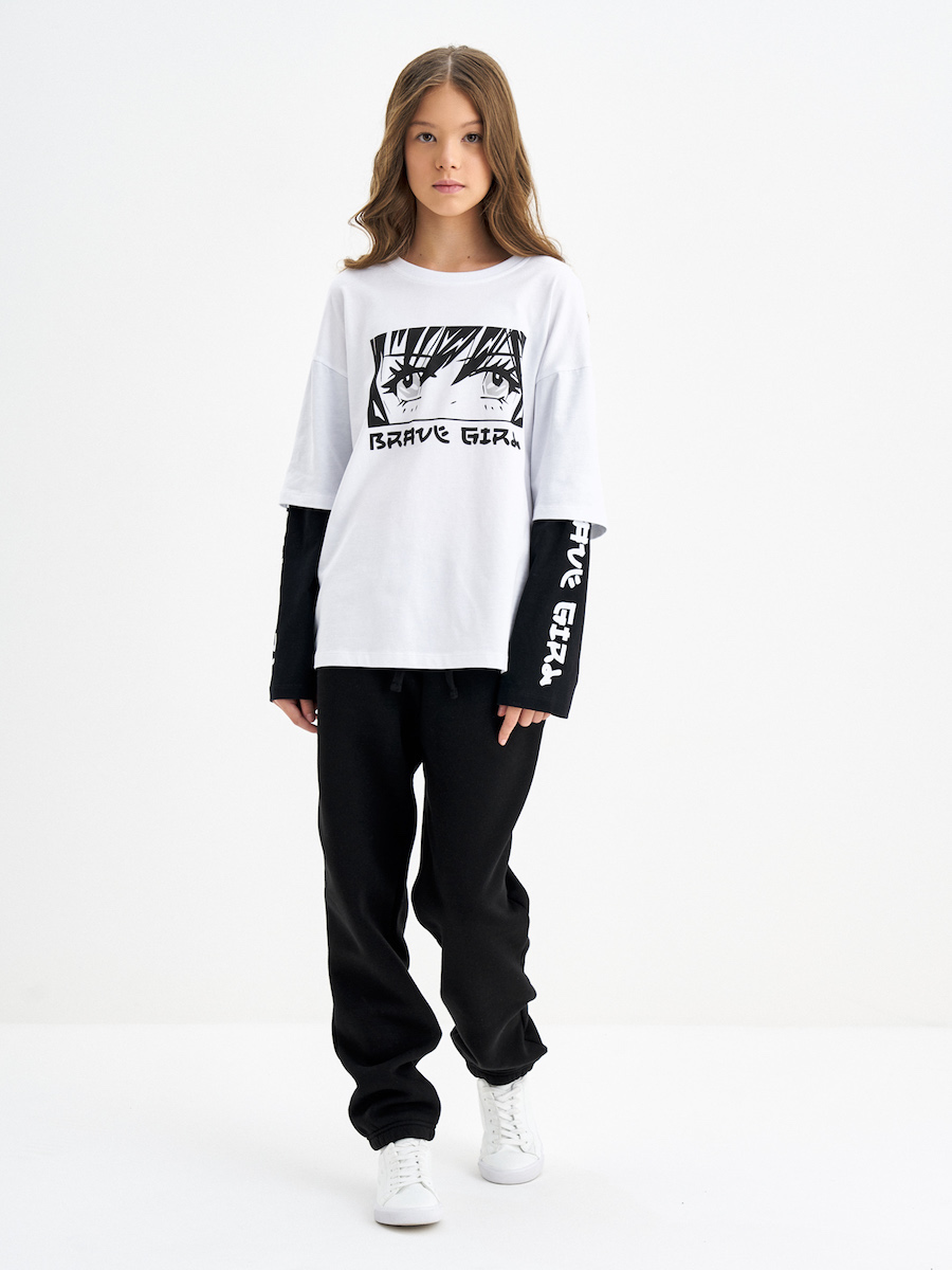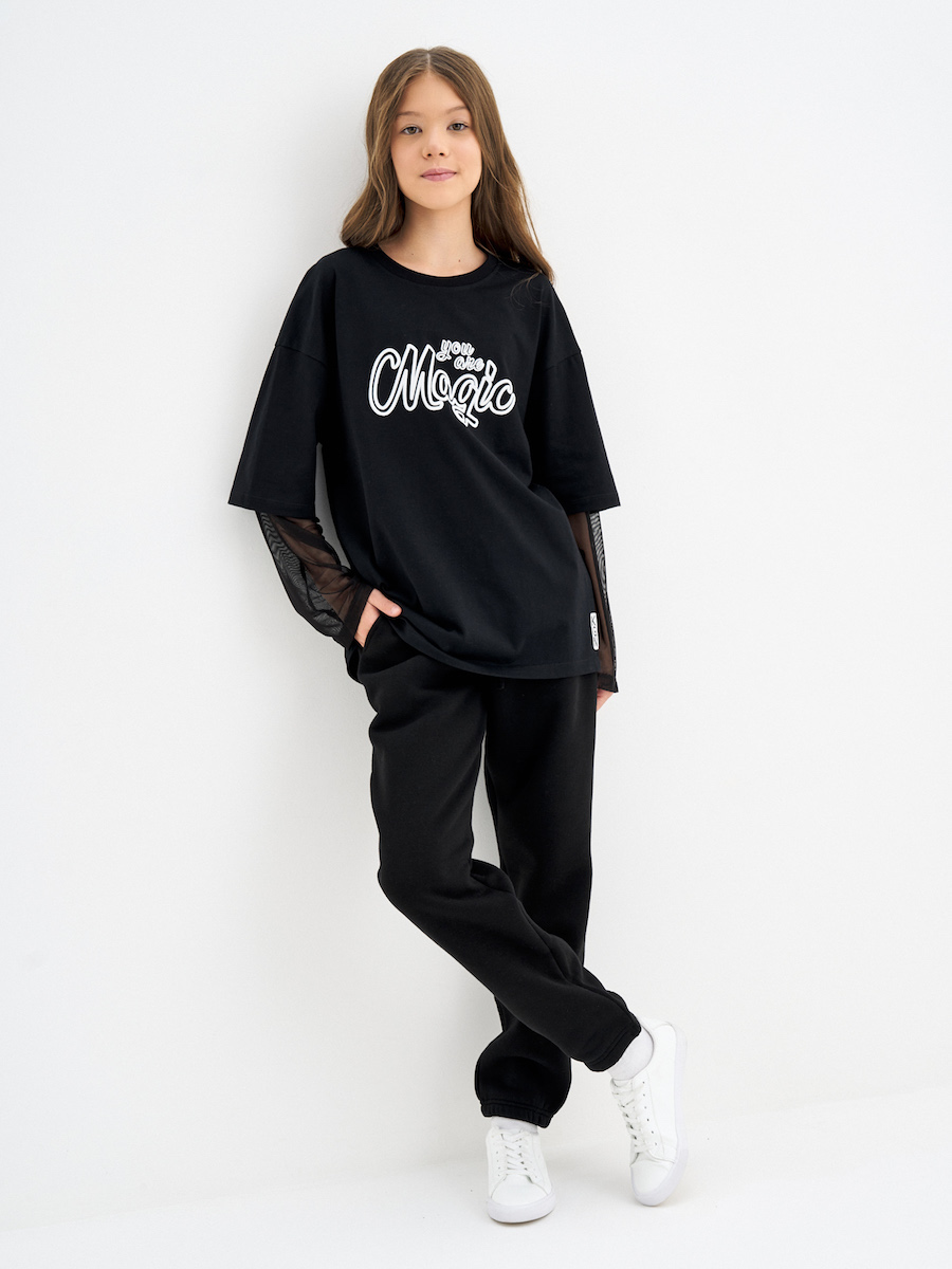 Брюки с карманами из футера с начесом для девочки, по низу брюки фиксируются резинкой, в поясе шнурок