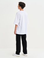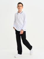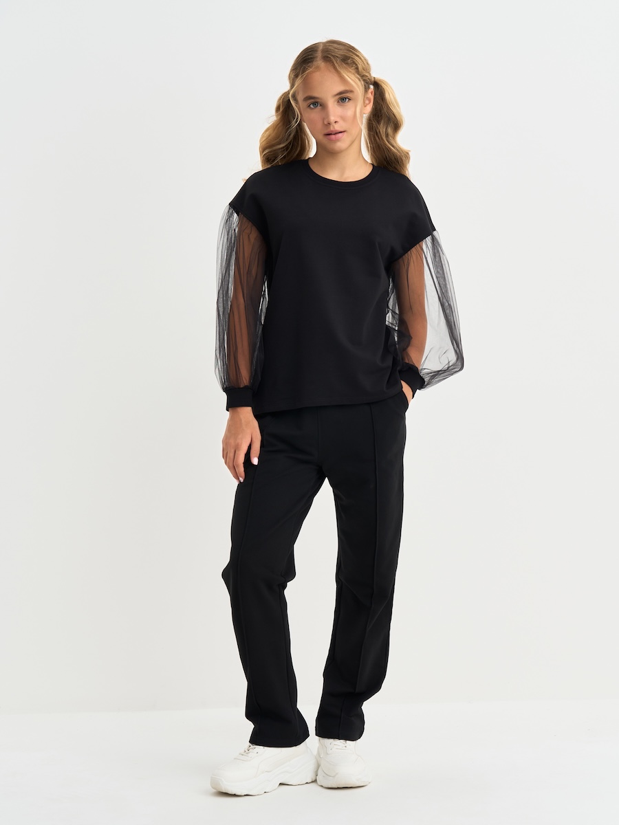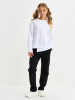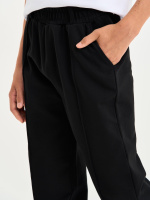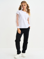 Брюки для детей и подростков, с отстрочкой посередине, пояс на резинке, с изнаночной стороны брюки усилены деталью из ткани. Штаны выполнены из петлевого футера с эластаном, состав 95% хлопок, 5% эластан.